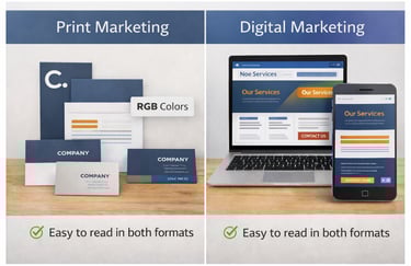 What looks great in print may not look good on the web, and what looks good on the web may not translate well to print. This is because print uses CMYK color profiles, while screens use RGB.